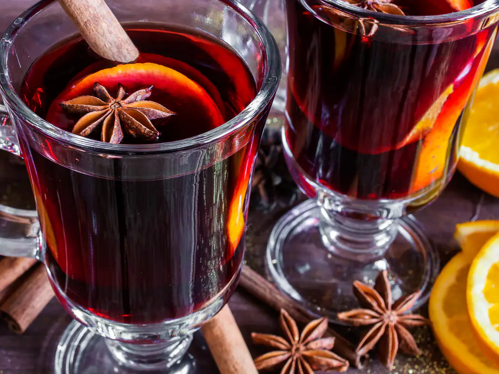 vin rouge, sucre roux, cannelle, étoile de badiane, clou de girofle, gingembre, muscade, orange, zeste de citron, zeste d'orange
