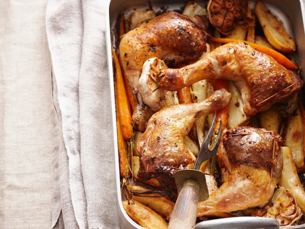ajouter un fond d’eau dans le plat avec la volaille et enfourner pour 1h15. arroser régulièrement la viande avec le jus pour éviter que cela ne soit trop sec. au bout de 30 minutes de cuisson, ajouter les légumes. mélanger et poursuivre la cuisson avec le reste des ingrédients.