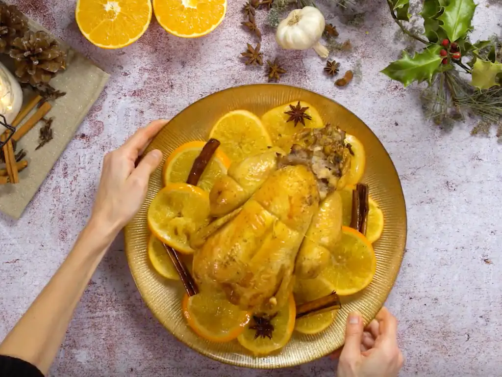 couper les oranges en rondelles. badigeonner la volaille d’huile dans un plat de cuisson. déposer les épices, le gingembre et les oranges. verser le bouillon, saler et poivrer.