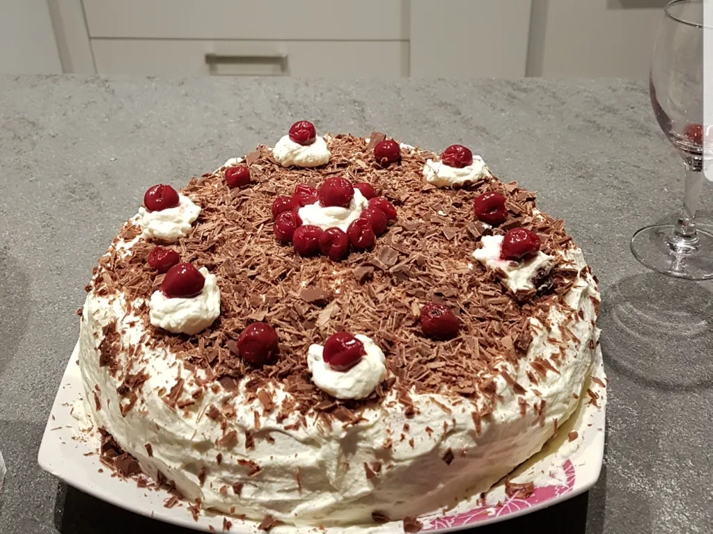 sucre vanillé, sucre, chocolat noir, crème fleurette, fixe chantilly, framboises, schnaps, sucre, farine, cacao, oeuf