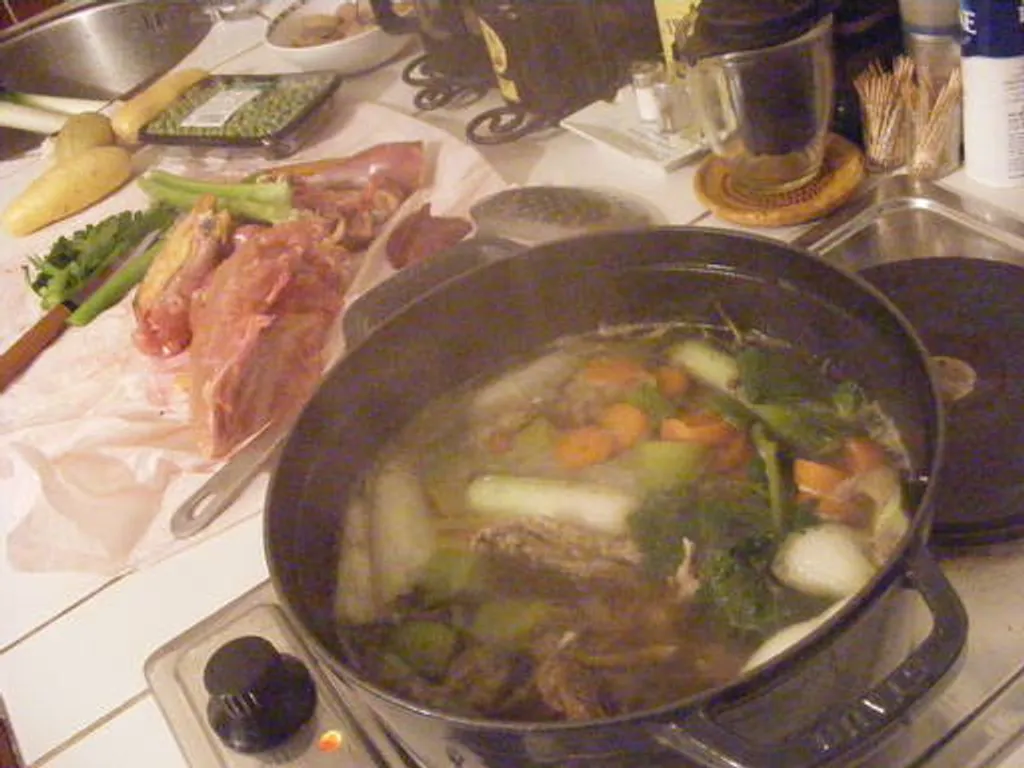 découper le poulet, enlever la peau, mettre l'os de veau et le dos de poulet avec les oignons, les carottes, les poireaux et les racines de persil, 2 branches de thym et 2 feuilles de laurier, le poivre et le sel dans 1,5l d'eau froide.